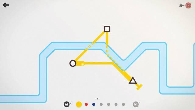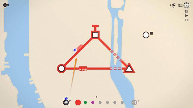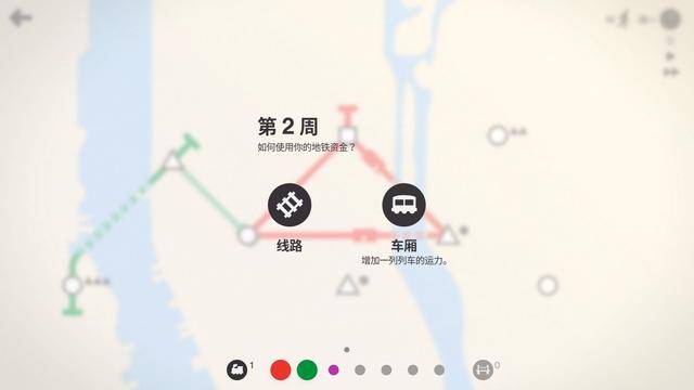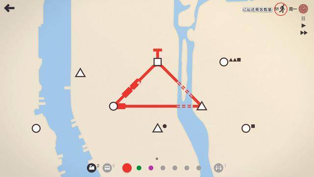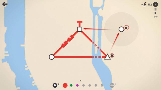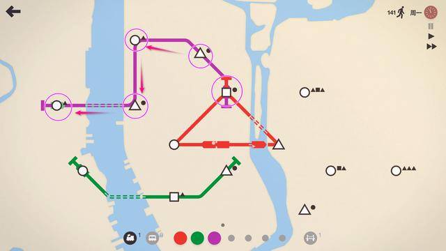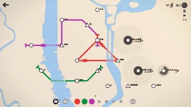 游戏初始拥有3条线路与3辆列车,以及若干数量的桥梁或隧道(看地图),下方的彩色小圆点即是当前拥有的线路,灰色表示还没有解锁,不同图标代表不同类型的站点,详细解析可在后文查阅,在各个站点的右上角标表示这个站点的人想要去的站点,我们所要做的就是连接路线解决供求。