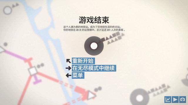 游戏并没有任务,每关的结局必定是以堵塞结束,就看你能在彻底堵塞前运送的最大人数了,各个站点在滞留达到6名乘客后开始显示堵塞百分比,当黑圆进度转满后游戏结束。