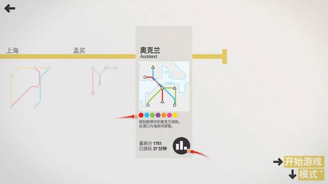 游戏目前已更新有纽约、上海、香港等共计20个世界各大城市的地图供我们选择,在选择界面下方彩色小圆圈表示这张地图你可以搭建的路线个数,比如这张地图可搭建路线上限为7条,下边的统计表点开后会显示世界排行榜,也可以切换到仅显示好友中排行。