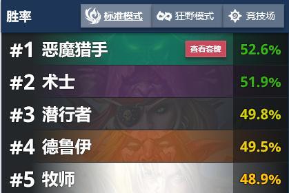如今的标准模式胜率前三甲是新职业恶魔猎手、术士以及盗贼。各职业的优秀卡组以快攻节奏瞎、奇迹瞎、祈求术、宇宙贼等最为突出。几套卡组的强度均是T1水平。