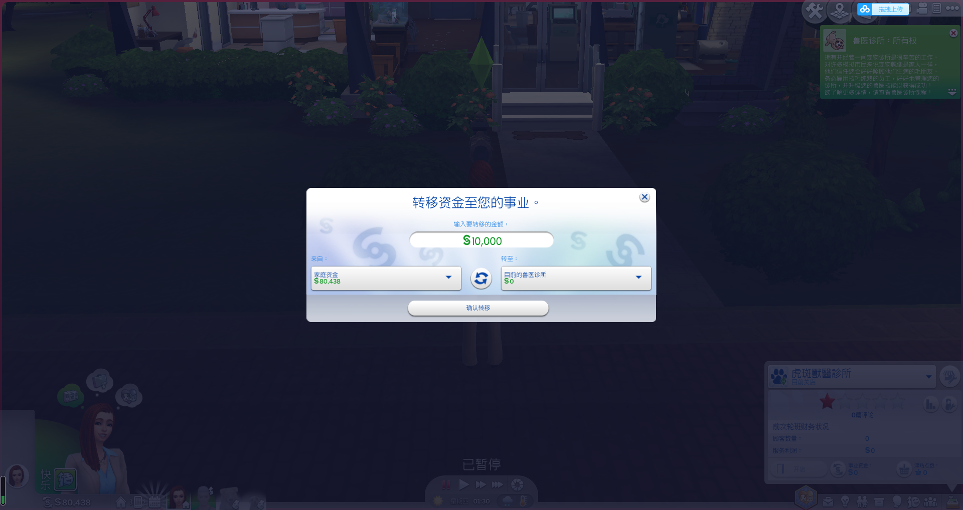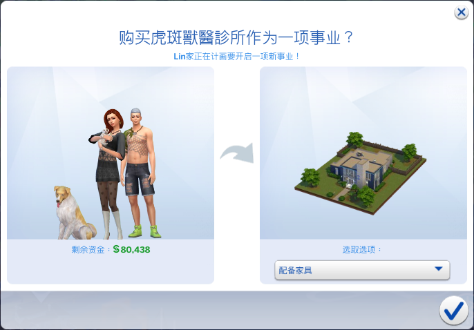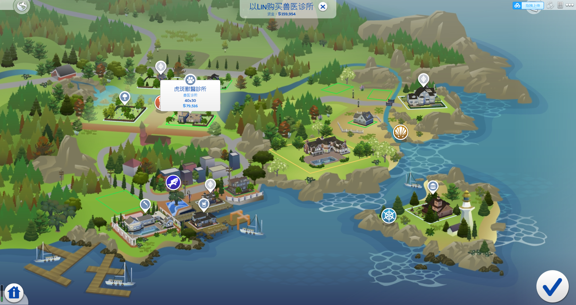 攒够钱后就可以开始模拟市民自己的事业了。在兽医诊所、零售商店和餐厅中间,我先选择了购买兽医诊所。一方面是因为它可以在模拟市民不在的情况下仍然开店,另外同时也可以让市民顺便提升兽医技能。在虎斑湾有间虎斑兽医诊所,我又懒得盖新的,所以就直接买现成的好了。
