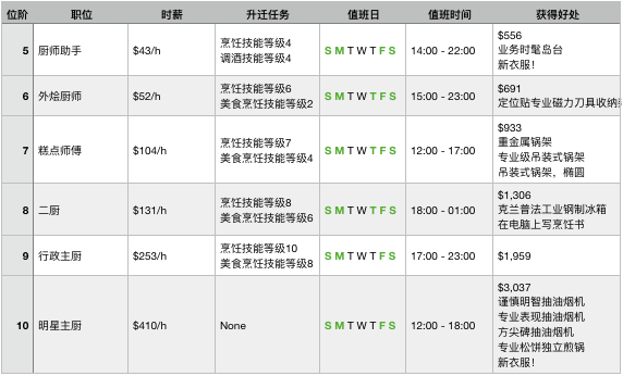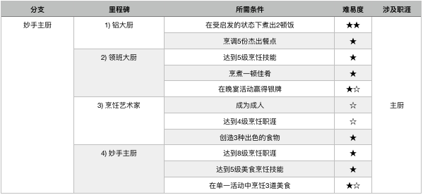 烹饪职涯期间可以顺便完成美食抱负。完成之后,会获得特征:新厨师。烹调好的食物永远不会腐坏。