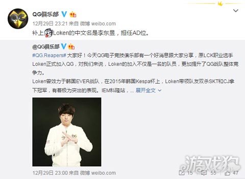 #QG.Reapers# 大家好!今天QG电子竞技俱乐部有一个好消息跟大家分享,原LCK职业选手Loken正式加入QG,对我们来说,Loken的加入不仅是一名的队员,更加提升了QG战队整体竞争力。