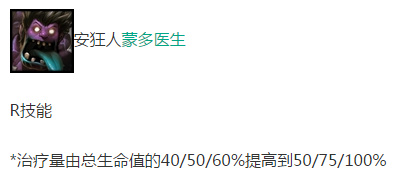 蒙多的Q技能在击杀单位后会立刻恢复既能消耗的全部血量。当蒙多对线十分逆风的时候蒙多上单,频繁的使用Q技能补刀既可以保证自身不被白白消耗,也可以配合被动来源源不断的恢复血量,进而保证不被越塔。