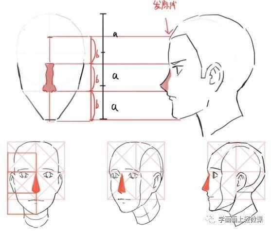 三庭:发际线到眉弓附近,眉弓附近到鼻底,鼻底到下巴的距离几乎相等。