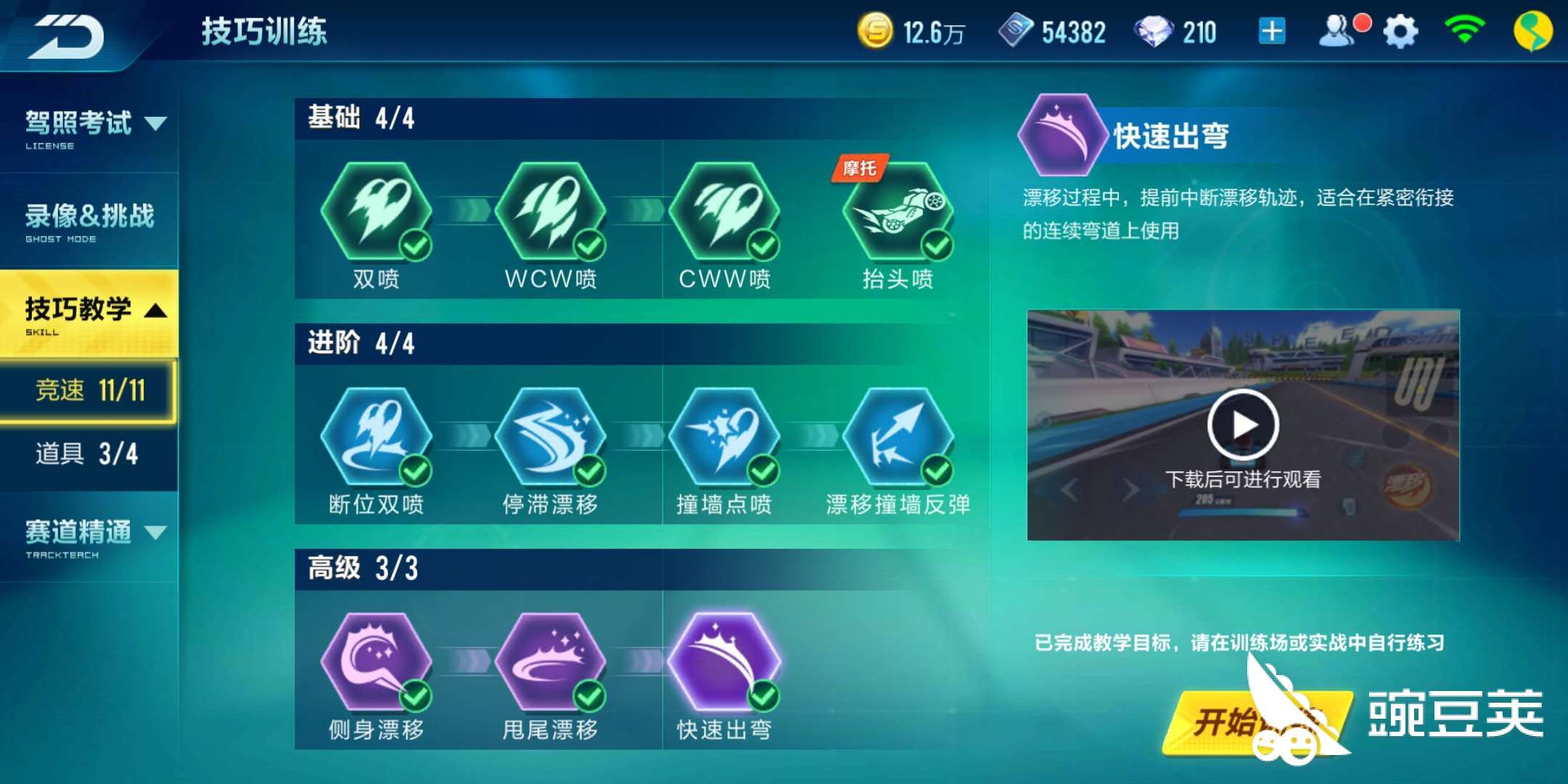 第一步:我们先在游戏里面找到技巧教学,在里面学习一下双喷、cww喷、wcw喷、断位漂移、快速出弯。把这些技巧学会之后我们再来进行跑图。但是在跑图的过程中我们要注意的就是控制好车的方向,因为有一些地方容易撞墙。