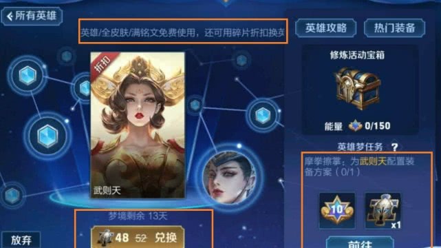 首先就是你开启的梦境里面的三名英雄,其中一名英雄是武则天。然后你就可以选择使用他这名英雄。如果确定了使用武则天之后,然后会有一个48碎片可以兑换的画面。意思就是如果你喜欢这名英雄的话,你就可以花48碎片去兑换了。而且还可以在右下角多领取10点的筑梦孙尚香新皮肤,和一个英雄碎片。这也是非常划算的一个东西。所以我劝大家不要嫌弃筑梦太麻烦。还是应该积极的去尝试。