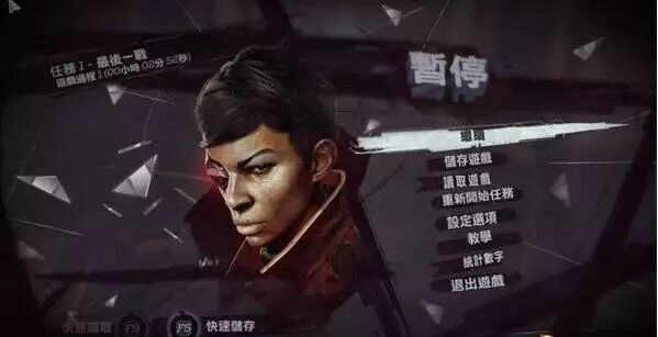 进入游戏后按ESC键呼叫界面功能,图中包含继续游戏,存储游戏,读取游戏,重新开始任务,设定选项耻辱攻略,教学,统计数据,退出游戏等8大选项,功能丰富可满足玩家对游戏进程的各类需求。