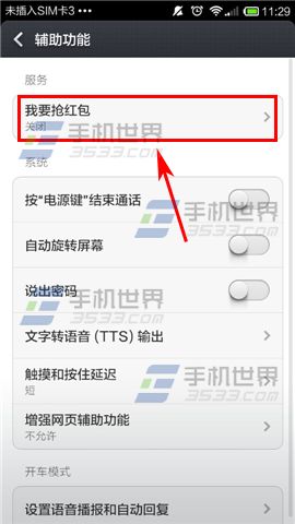 1)打开我要抢红包,进入首页后qq怎么抢红包,点击上方的开启抢红包服务的入口,跳转至本地的辅助功能页面点击我要抢红包。(如下图)