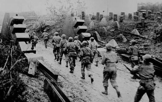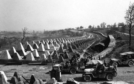 身处四面围困的德国也早就预料到了有一天会进行本土作战的情况,在法国修建“马奇诺防线”的时候,1936年德国人占领莱茵兰地区后开始在当地开始修建“齐格菲防线”。整个“齐格菲防线”长630千米,主要有地雷区、铁丝网、反坦克壕沟以及无数的钢筋混凝土碉堡构成,另外还有无数的“龙牙”,也就是反坦克水泥墩。